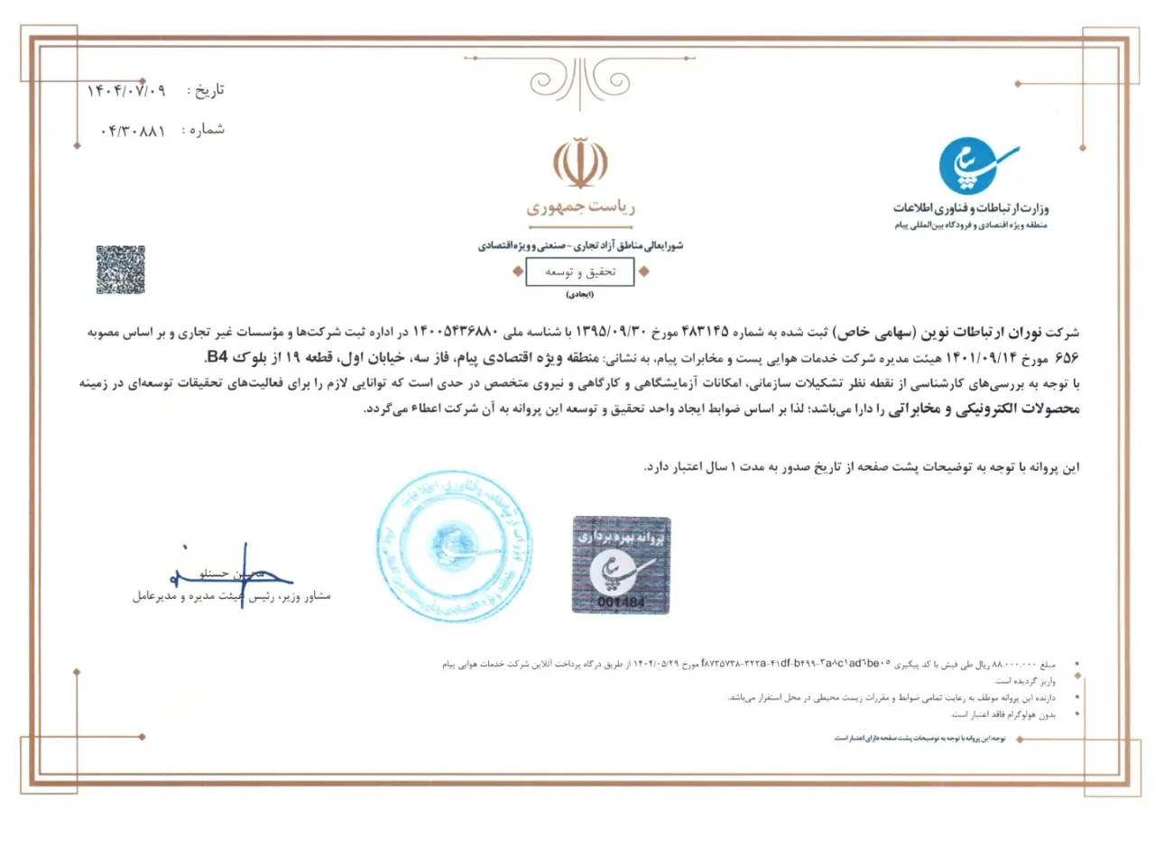 این گواهینامه که از سوی منطقه ویژه اقتصادی و فناوری اطلاعات و ارتباطات پیام صادر شده است، تأییدی است بر توانمندی فنی و تخصصی شرکت نوران در زمینهی توسعه محصولات الکترونیکی و مخابراتی.